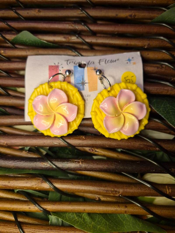 Runde Ohrringe aus Polymer Clay mit einer großen Hibiskus Blume