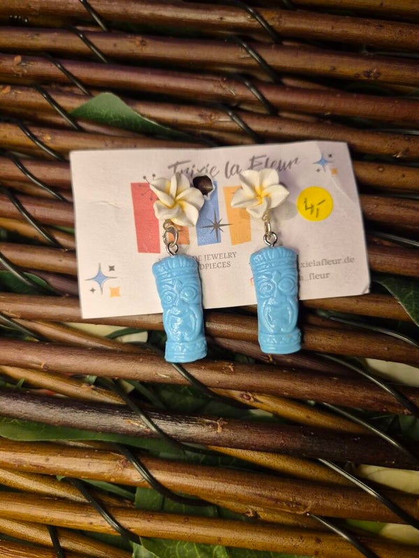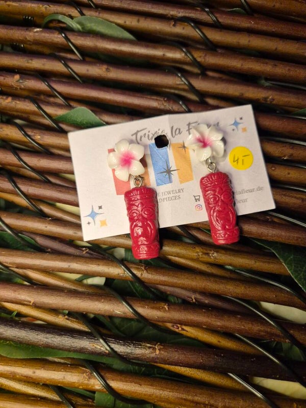 Kleine Totem Ohrringe aus Polymer Clay mit Hibiskus Blume als Ohrstecker.